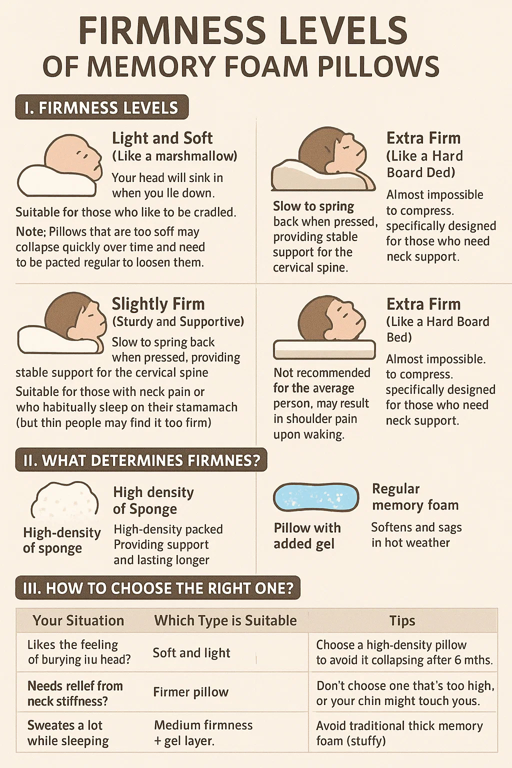 | Dormir caliente o sudar con frecuencia | Firmeza media Capa de gel | Evite la espuma sólida tradicional (atrapa el calor) |