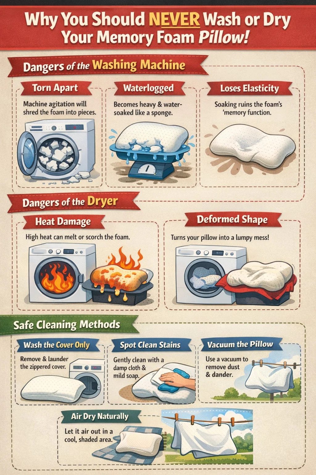 La respuesta directa es: ¡Por supuesto que no hagas esto! Mientras lanzas tu almohada de espuma viscoelástica directamente en la lavadora y secadora puede parecer sencillo e higiénico, esta acción prácticamente "asesinará" su almohada. He aquí por qué definitivamente deberías evitar estas dos máquinas y algunos métodos de limpieza más confiables: