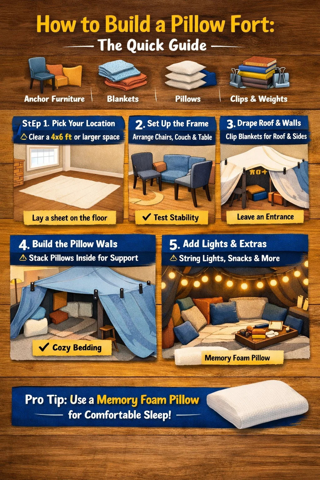 La construcción de un fuerte de almohadas se reduce a cuatro pasos básicos: elija una estructura de base fuerte (como un sofá o sillas), coloque mantas sobre la parte superior para formar paredes y un techo, apile almohadas a lo largo de los bordes y el interior para brindar apoyo y aislamiento, luego asegure todo con clips u objetos pesados. Un fuerte bien construido puede mantener su forma durante horas y, con las almohadas adecuadas en su interior, se vuelve realmente cómodo y no sólo una novedad infantil.