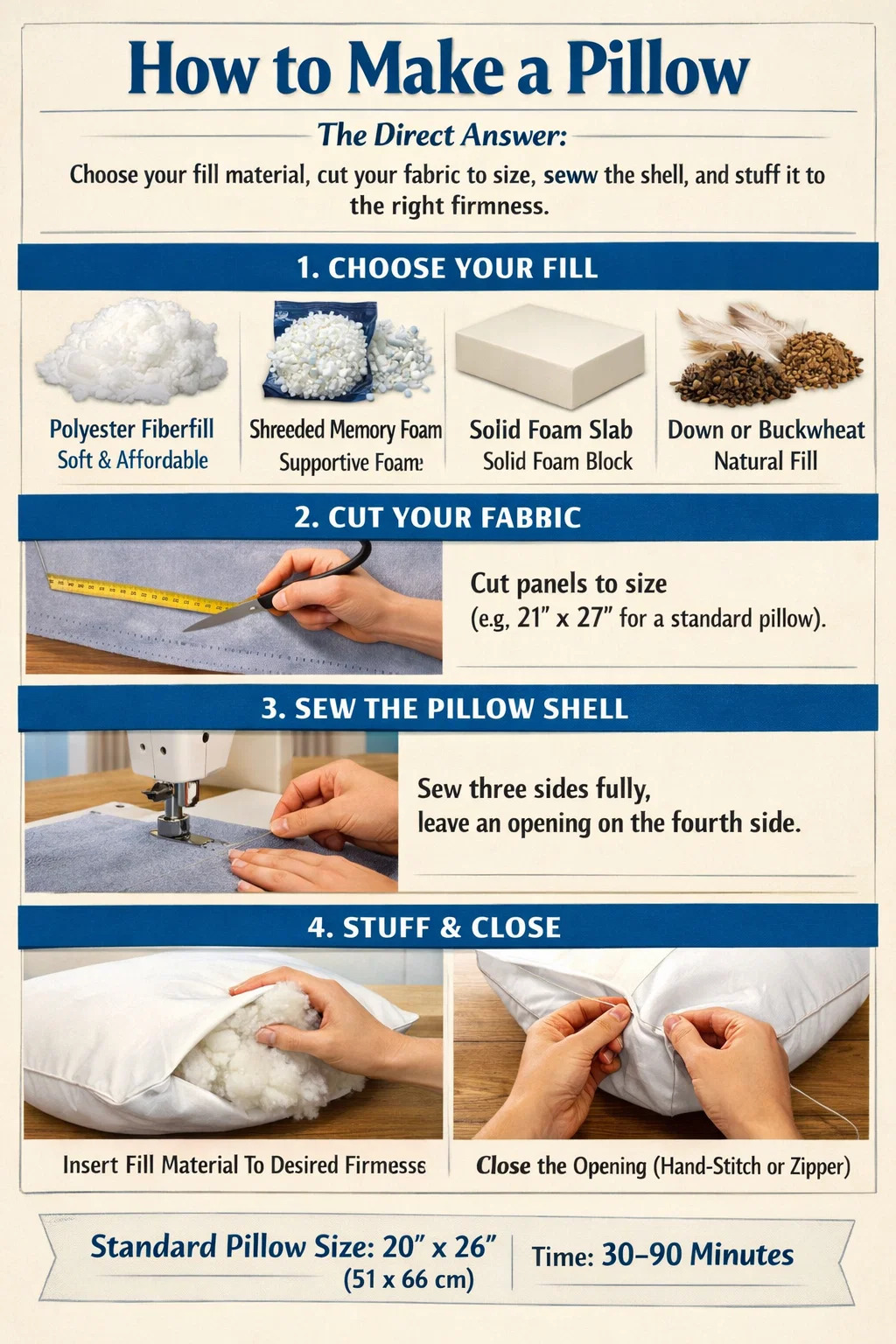 Hacer una almohada se reduce a cuatro conceptos básicos: elegir el material de relleno, cortar la tela a la medida, coser la carcasa y rellenarla con la firmeza adecuada. Para la mayoría de las personas, una almohada de cama estándar mide 20 × 26 pulgadas (51 × 66 cm) , y todo el proceso, desde cortar la tela hasta cerrar la costura final, demora entre 30 y 90 minutos, según el tipo de relleno. Si está trabajando con una almohada de espuma viscoelástica, el proceso difiere ligeramente porque está cortando o triturando espuma en lugar de rellenarla con fibras sueltas, pero el enfoque estructural sigue siendo el mismo.