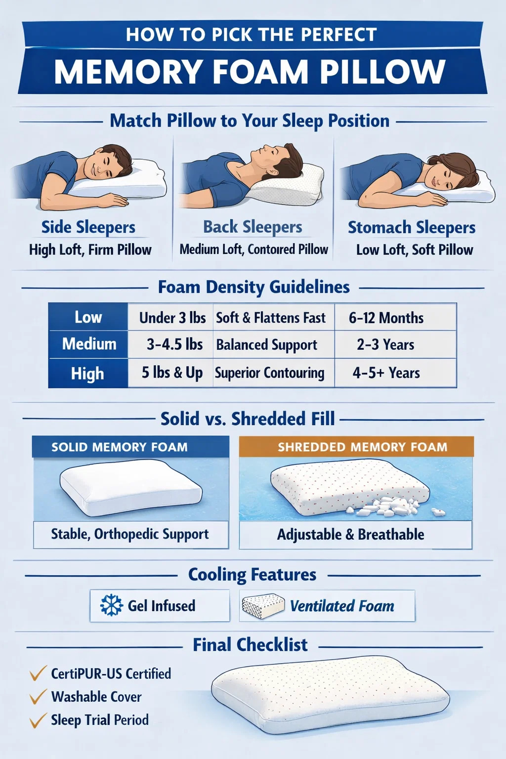Para elegir lo correcto almohada de espuma viscoelástica , debe hacer coincidir la "altura" (altura) y la "firmeza" de la almohada con su posición principal para dormir. Las personas que duermen de lado deben elegir una almohada firme y alta para llenar el espacio entre los hombros; quienes duermen boca arriba necesitan una almohada de altura media con contorno de cuello; y quienes duermen boca abajo requieren una espuma muy fina y suave o un relleno rallado. Más allá de la posición, compruebe siempre el densidad de la espuma (Apunte a 3,5 lbs/ft³ o más) para garantizar durabilidad y soporte a largo plazo.