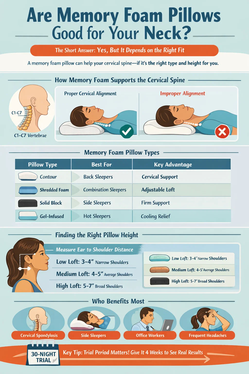 Para la mayoría de las personas que padecen malestar cervical general, un almohada de espuma viscoelástica contorneada con zonas dobles (una cresta más alta, una cresta más baja) ofrece el soporte más versátil. El lado superior permite dormir de lado, mientras que el lado inferior sirve para dormir boca arriba. Este diseño refleja directamente las recomendaciones que suelen dar los fisioterapeutas para las cefaleas cervicogénicas y la tensión del trapecio superior.