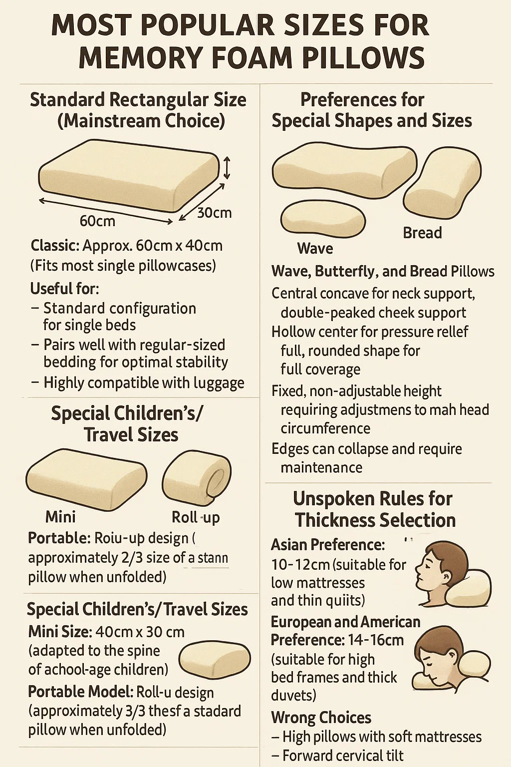 Puntos débiles ocultos: → Las almohadas para niños deben cambiar de tamaño cada 5 años (a medida que aumenta su altura) → Las almohadas de viaje comprimidas durante más de 3 meses pueden dañar su elasticidad